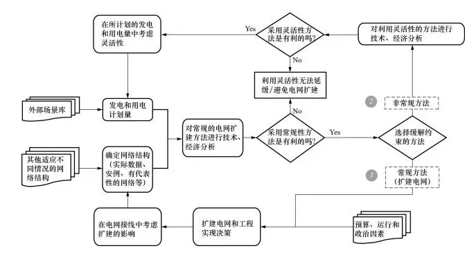 目前,法國配電公司(ERDF)正在研究如何利用發(fā)電側(cè)和需求側(cè)的靈活性來緩解電壓、線路傳輸容量的限制,從而避免/延緩電網(wǎng)擴(kuò)建的問題,文獻(xiàn)[13]就此給出了一個(gè)通用框架(如圖4所示),對(duì)常規(guī)的電網(wǎng)擴(kuò)建方法和利用電網(wǎng)靈活性的方法進(jìn)行技術(shù)、經(jīng)濟(jì)比較,選擇成本效益最高的作為最終方案。發(fā)電、用電資源的靈活性是從容量、持續(xù)時(shí)間和頻率等幾方面來定義的,而這不僅需要負(fù)荷持續(xù)時(shí)間曲線,還需要隨機(jī)時(shí)序負(fù)荷曲線,其預(yù)測(cè)方法也是ERDF目前正致力于研究的一個(gè)領(lǐng)域。在進(jìn)行技術(shù)、經(jīng)濟(jì)比較時(shí),主要是比較采用某方案所需要的成本和該方案能夠減少電量不足期望值(ExpectedEnergyNotSupplied,EENS)所帶來的收益,如果前者小于后者,則該方案是具有成本效益的。另外,文獻(xiàn)[13]認(rèn)為,雖然在有些情況下利用電網(wǎng)靈活性可能很難達(dá)到電網(wǎng)擴(kuò)建后高可靠、高質(zhì)量的供電,但是如果能夠獲得較好的成本效益,利用電網(wǎng)靈活性來推遲電網(wǎng)擴(kuò)建也是合理的。