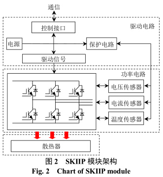 賽米控智能集成功率(Semikron integrated intel-ligent power,SKIIP)模塊[6]集成了功率半導體器件、散熱器以及具有保護和監(jiān)測電路的門極驅動電路,并具有用于短路和過電流保護的閉環(huán)電流傳感器,同時還集成了溫度傳感器。采用SKIIP模塊[6]可以大大簡化逆變器主電路,提高系統(tǒng)的抗干擾能力,該模塊具有標準接口,其架構如圖2所示。