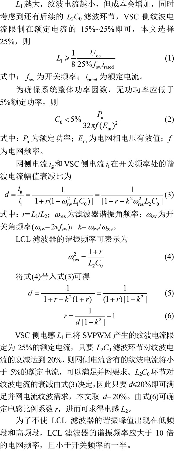 相對于傳統(tǒng)的單電感濾波器,3階LCL濾波器能更好地抑制并網變換器引起的電流諧波。LCL濾波器的參數對系統(tǒng)的動態(tài)及穩(wěn)態(tài)性能影響很大,文獻[7]對LCL濾波器參數的限制條件以及設計步驟做了詳細介紹,本文在此基礎上確定LCL濾波器的參數。根據VSC側電流最大允許紋波得到VSC側電感L1的最小值,根據系統(tǒng)的無功功率限定值求得濾波電容C0,最后根據并網電流總諧波得到網側電感L2。