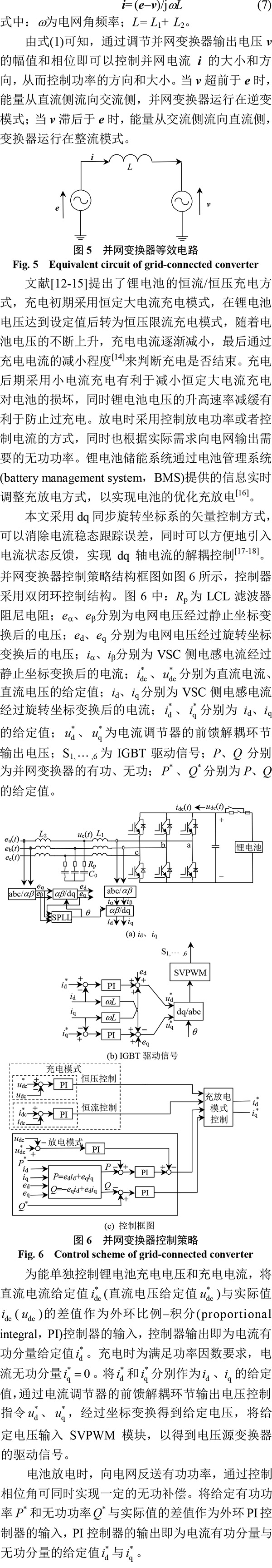 鋰電池儲能并網變換器的等效電路如圖5所示。并網變換器電壓v與電網電壓e控制的并網電流i之間的關系為