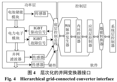 傳統(tǒng)的電力電子控制系統(tǒng)基本以集中式控制模式為主,控制系統(tǒng)與底層硬件的相互依賴性較大,且靈活性和擴展性較差[8-10]。并網變換器控制系統(tǒng)采用按功能進行分層控制的架構,充分發(fā)揮了數字控制和數字通信的優(yōu)勢,同時該架構的設計更利于實現系統(tǒng)的自治控制,也利于上層調度。