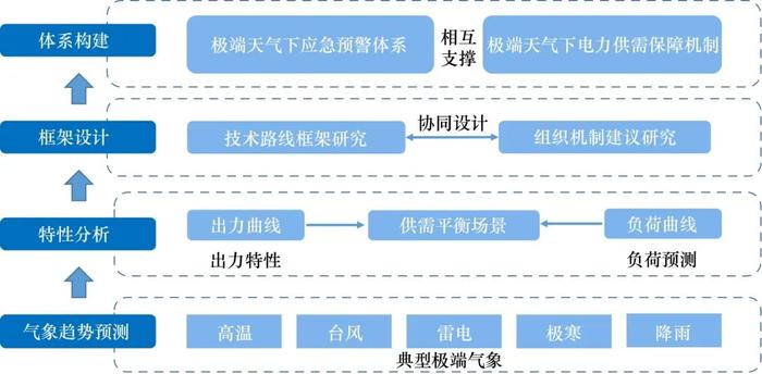 在供需結構方面,基于極端氣象特征、氣象發(fā)展趨勢研究成果,分析極端天氣下新能源波動、負荷可調節(jié)的電力供需平衡場景,攻關電力供需保障技術,構建電力系統(tǒng)應急組織機制,提出電力系統(tǒng)在極端天氣下的應急預警體系。