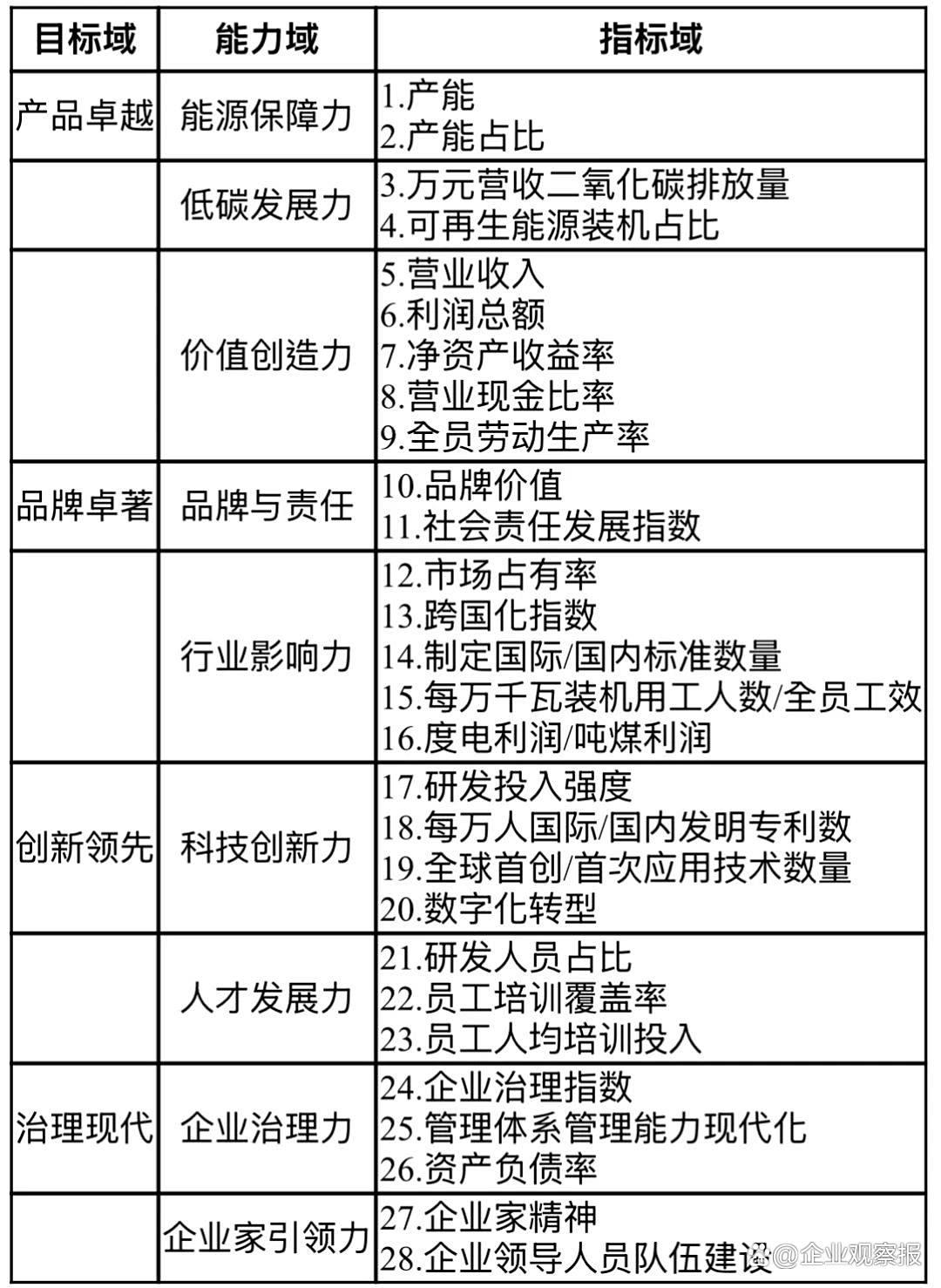 緊扣黨中央關(guān)于加快建設(shè)世界一流企業(yè)政策精神,結(jié)合國資委要求和企業(yè)發(fā)展戰(zhàn)略,基于對世界一流能源電力企業(yè)特征與發(fā)展趨勢研究,參考國內(nèi)外權(quán)威機(jī)構(gòu)研究成果,以世界一流企業(yè)建設(shè)“產(chǎn)品卓越、品牌卓著、創(chuàng)新領(lǐng)先、治理現(xiàn)代”的核心內(nèi)涵為目標(biāo),研究世界一流企業(yè)建設(shè)的目標(biāo)與關(guān)鍵能力之間的關(guān)系,再由每項關(guān)鍵能力延伸出具體關(guān)鍵指標(biāo)要素,從而構(gòu)建出世界一流能源電力企業(yè)對標(biāo)指標(biāo)體系,應(yīng)用于能源電力企業(yè)競爭力的對標(biāo)分析評價。