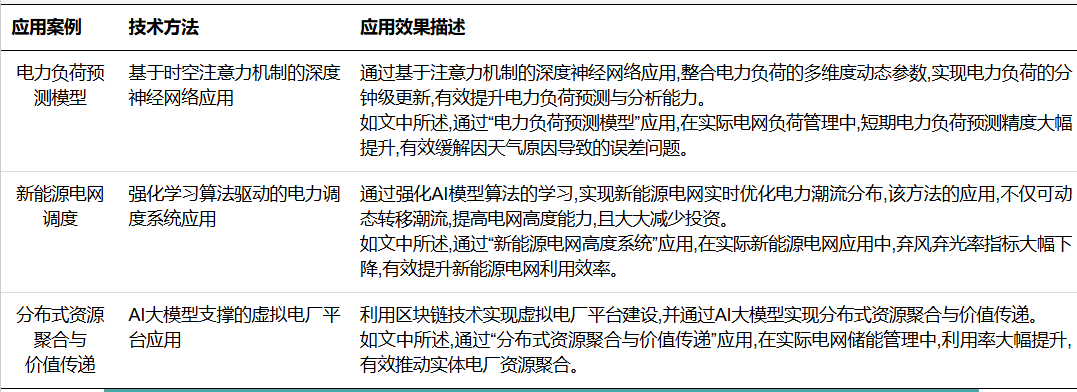 傳統(tǒng)的電力系統(tǒng)供需匹配存在發(fā)電慣性大、儲能能力不足、調(diào)峰能力有限、跨區(qū)域調(diào)配壁壘等問題,在大模型技術(shù)支撐下電力系統(tǒng)供需匹配的復(fù)雜性得到系統(tǒng)性突破?;跁r空注意力機(jī)制(指在時間和空間維度上對輸入數(shù)據(jù)進(jìn)行自適應(yīng)處理的方法)的深度神經(jīng)網(wǎng)絡(luò),整合用戶側(cè)用電數(shù)據(jù)、分布式能源+儲能、電力市場交易信息等多維度動態(tài)參數(shù),構(gòu)建起分鐘級更新的負(fù)荷預(yù)測模型。筆者根據(jù)《國家電網(wǎng)報》的數(shù)據(jù)統(tǒng)計(jì)得出:2024年,在華東某省級電網(wǎng)的實(shí)測中,基于智能電網(wǎng)的AI大模型預(yù)測電網(wǎng)負(fù)荷,全網(wǎng)平均負(fù)荷預(yù)測準(zhǔn)確率達(dá)98.49%,日最高負(fù)荷預(yù)測準(zhǔn)確率達(dá)99.08%,數(shù)據(jù)收集工作時長從30 min縮短至2 min,有效緩解傳統(tǒng)預(yù)測方法因天氣突變導(dǎo)致的誤差放大問題;針對高比例新能源接入的電網(wǎng),強(qiáng)化學(xué)習(xí)算法驅(qū)動的調(diào)度系統(tǒng)實(shí)時優(yōu)化電力潮流分布,在西北某新能源基地的應(yīng)用案例中,棄風(fēng)棄光率(指在一定時間內(nèi),因各種原因?qū)е碌娘L(fēng)電和光伏發(fā)電未能被充分利用的比例)從12.6%降至3.8%,分布式潮流控制裝置總?cè)萘繛?.8萬kVA,可動態(tài)轉(zhuǎn)移潮流10萬kW;大模型支撐的虛擬電廠平臺聚合海量分布式資源,通過區(qū)塊鏈技術(shù)實(shí)現(xiàn)價值傳遞,在國家電網(wǎng)廣東省試點(diǎn)項(xiàng)目中,用戶側(cè)儲能系統(tǒng)的利用率提升60%,需求響應(yīng)參與度達(dá)到83%,通過智能化的供需協(xié)同機(jī)制與AI大模型的深度應(yīng)用(如表2所示),推動電力系統(tǒng)向“源網(wǎng)荷儲”深度互動的新型模式演進(jìn)[3]。同時,為避免單一數(shù)據(jù)源出現(xiàn)信息失真,國家電網(wǎng)通過AI大模型對溫度、濕度、風(fēng)速等主要參數(shù)進(jìn)行三重校驗(yàn)與交叉驗(yàn)證,有效避免數(shù)據(jù)誤差造成預(yù)測失真的問題。