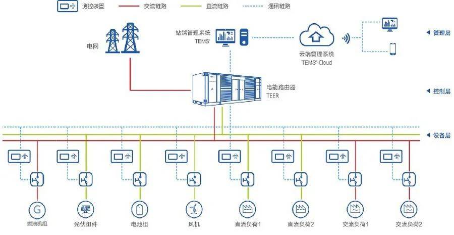 基于電力電子變壓器的交直流混合微網(wǎng)系統(tǒng)總體可分為三層架構(gòu)。第一層為設(shè)備層,主要囊括了分布式電源(風(fēng)電、光伏系統(tǒng)等)和不同的交直流負荷;第二層控制層,以電力電子變壓器為核心,分布式電源和負荷可通過其靈活的多端口配置實現(xiàn)可靠接入,并通過其中/高壓接口,實現(xiàn)與配電網(wǎng)的有效連接;第三層為管理層,以“雙端”能量管理系統(tǒng)為核心,采用人工智能算法可實現(xiàn)電力電子變壓器交直流混合系統(tǒng)的分布式能源互補優(yōu)化以及多個端口之間的協(xié)調(diào)控制,提高能源利用效率,多機并聯(lián)系統(tǒng)的集群控制、功率在線優(yōu)化分配,保障系統(tǒng)效率最優(yōu),同時能夠?qū)与娋W(wǎng)調(diào)度,參與電力市場交易及輔助服務(wù)等,真正實現(xiàn)綠色數(shù)據(jù)中心電能的智能路由。