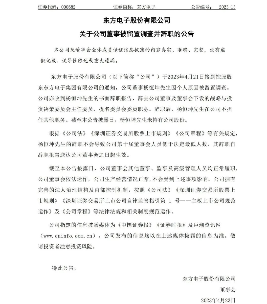 東方電子集團所屬上市公司東方電子4月23日晚間公告稱,公司董事楊恒坤先生因個人原因被留置調查。