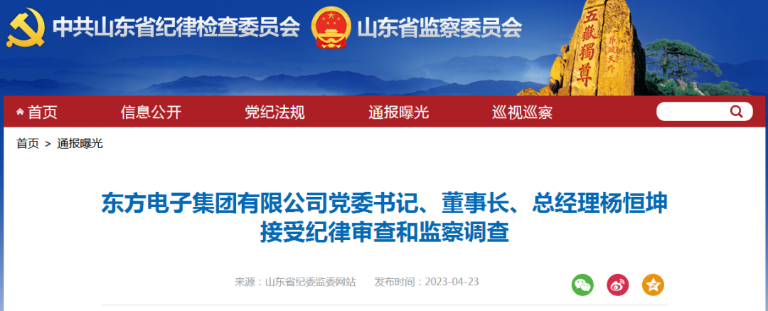 山東省紀委監(jiān)委網站4月23日消息,據煙臺市紀委監(jiān)委消息:東方電子集團有限公司黨委書記、董事長、總經理楊恒坤涉嫌嚴重違紀違法,目前正接受煙臺市紀委監(jiān)委紀律審查和監(jiān)察調查。