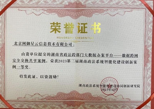 網(wǎng)御星云作為協(xié)辦單位受邀出席本次大會,公司申報的“湖南省政法跨部門大數(shù)據(jù)辦案平臺——數(shù)據(jù)跨網(wǎng)安全交換共享案例”榮獲2023第三屆湖南政法系統(tǒng)智能化建設(shè)創(chuàng)新案例一等獎!