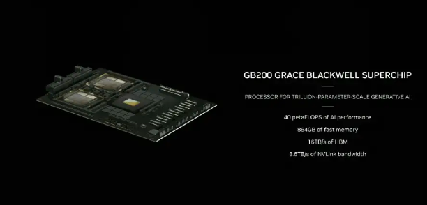 發(fā)布會(huì)直播截圖這些超級(jí)AI芯片相比英偉達(dá)自身產(chǎn)品也有巨大提升。據(jù)介紹,B200擁有2080億個(gè)晶體管,而H100/H200有800億個(gè)晶體管,采用臺(tái)積電4NP工藝制程,可以支持多達(dá)10萬億個(gè)參數(shù)的AI大模型。GB200將兩個(gè)B200 Blackwell GPU與一個(gè)基于Arm的Grace CPU進(jìn)行配對(duì)。