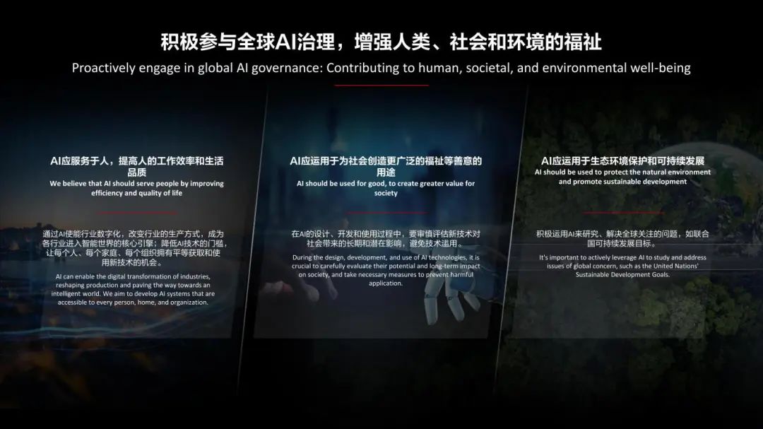 我們認(rèn)為AI應(yīng)服務(wù)于人,提高人的工作效率和生活品質(zhì),通過AI使能行業(yè)數(shù)字化,改變行業(yè)的生產(chǎn)方式,成為各行業(yè)進(jìn)入智能世界的核心引擎;要持續(xù)降低AI的技術(shù)門檻,讓每個(gè)人、每個(gè)家庭、每個(gè)組織擁有平等獲取和使用新技術(shù)的機(jī)會(huì)。同時(shí),AI應(yīng)運(yùn)用于為社會(huì)創(chuàng)造更廣泛的福祉等善意的用途,在AI的設(shè)計(jì)、開發(fā)和使用過程中,要審慎評(píng)估新技術(shù)對(duì)社會(huì)帶來的長期和潛在影響,避免技術(shù)濫用。以及,AI應(yīng)運(yùn)用于生態(tài)環(huán)境保護(hù)和可持續(xù)發(fā)展,積極運(yùn)用AI來研究、解決全球關(guān)注的問題,如聯(lián)合國可持續(xù)發(fā)展目標(biāo)。