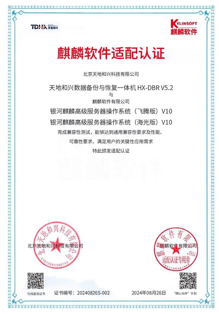 經(jīng)過嚴(yán)格測(cè)試與深度合作,天地和興與麒麟軟件順利完成了產(chǎn)品兼容性認(rèn)證。測(cè)試結(jié)果表明,天地和興的數(shù)據(jù)備份與恢復(fù)一體機(jī)在麒麟軟件銀河麒麟高級(jí)服務(wù)器操作系統(tǒng)V10上運(yùn)行穩(wěn)定,表現(xiàn)出色,充分滿足了用戶在性能和可靠性方面的需求。