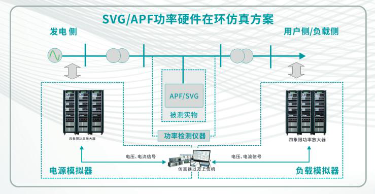 SVG/APF功率硬件在環(huán)仿真方案:在新型電力系統(tǒng)應用場景中,PAS放大器與仿真器的結合,能夠對發(fā)電側和負載側進行數(shù)字化模擬,結合功率檢測儀的實測數(shù)據(jù),通過數(shù)據(jù)采集系統(tǒng),可實現(xiàn)以APF,SVG為被測設備的半實物功率硬件在環(huán)仿真測試。
