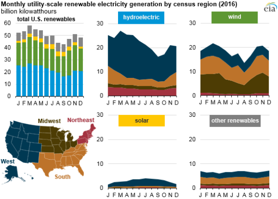 從發(fā)電量來(lái)看,今年3月份,美國(guó)可再生能源發(fā)電量達(dá)到全年最高。從地方來(lái)看,大部分可再生能源來(lái)自西部地區(qū),尤其是水電(占63%)和太陽(yáng)能發(fā)電(占77%)。風(fēng)電產(chǎn)業(yè)相對(duì)發(fā)展比較均衡,中部地區(qū)占37%,南部占35%,西部占24%,東北部地區(qū)占4%。