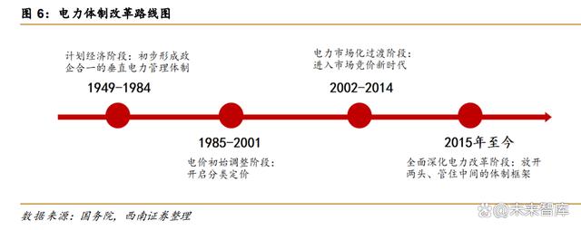 從我國電價政策機制發(fā)展歷程來看,我國電價政策機制發(fā)展歷程大致可以分成四個階段: 1)計劃經(jīng)濟階段(1949-1984 年):1950 年,我國成立電力行業(yè)管理局,初步形成以中央 領導為主、地方領導為補充的政企合一的垂直電力管理體制;2)電價初始調(diào)整階段 (1985-2001 年):1985 年,以國家經(jīng)濟委員會、國家計劃委員會、水利電力部、國家物價 局發(fā)布的《關于鼓勵集資辦電和實行多種電價的暫行規(guī)定》為標志,開啟分類定價;3)電力 市場化過渡階段(2002-2014 年):2002 年國務院發(fā)布《電力體制改革方案》,標志著我國 電力行業(yè)定價正式告別政府定價,進入市場競價新時代。4)全面深化電力改革階段(2015 年至今):2015 年,中共中央國務院下發(fā)《關于進一步深化電力體制改革的若干意見》(中發(fā) [2015]9 號),確定了“三放開、一獨立、三強化"的改革基本路徑以及"放開兩頭、管住中間" 的體制框架。 新一輪電力體制改革加速推進。傳統(tǒng)電力系統(tǒng)調(diào)度模式為“源隨荷動”,根據(jù)用電側來 調(diào)整電源側的發(fā)電量,新型電力系統(tǒng)下電源側發(fā)電量和負荷側用電量均不可控,加大了電力 調(diào)度難度。而目前電網(wǎng)調(diào)度方式主要是面向常規(guī)電源為主的計劃調(diào)度機制,電力體制改革隨 之深化。