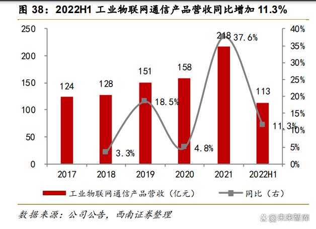 公司系工業(yè)物聯(lián)網龍頭,產品適用范圍廣。公司深耕工業(yè)物聯(lián)網二十年,在智能電力、 智能制造、智能零售、智慧城市等領域積累了諸多國內外優(yōu)質客戶,市場涵蓋中國、美國、 德國、英國等全球主要發(fā)達工業(yè)國家,良好的客戶資源為公司持續(xù)穩(wěn)定發(fā)展提供了有力保障。 工業(yè)物聯(lián)網通信產品可適用于各種工業(yè)領域,用于各種無人值守環(huán)境下工業(yè)設備的聯(lián)網, 2021 年工業(yè)物聯(lián)網通信產品營收達 218 億元,同比高增 37.6%,2022H1 營收 113 億元, 同比增加 11.3%。