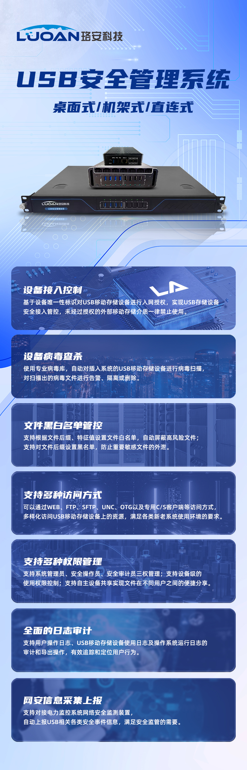 珞安科技作為國(guó)內(nèi)工控安全領(lǐng)域技術(shù)先進(jìn)、實(shí)力深厚的優(yōu)秀企業(yè),針對(duì)USB移動(dòng)存儲(chǔ)介質(zhì)防護(hù)難題,自主研發(fā)USB安全管理系統(tǒng),通過技術(shù)手段與管理制度相結(jié)合來(lái)加強(qiáng)移動(dòng)介質(zhì)的管控,實(shí)現(xiàn)移動(dòng)介質(zhì)的權(quán)限控制、無(wú)毒驗(yàn)證、操作審計(jì)等方面的全流程管控,滿足工業(yè)企業(yè)USB移動(dòng)存儲(chǔ)介質(zhì)安全管理需求。