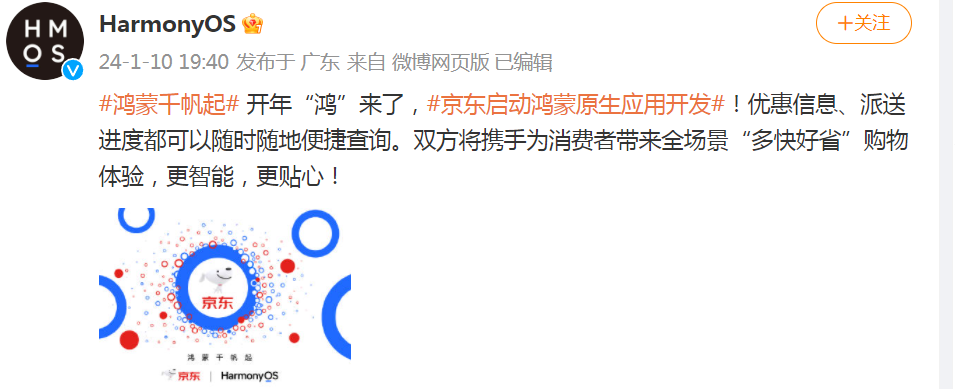 1月10日晚,HarmonyOS微博發(fā)文稱:京東啟動(dòng)鴻蒙原生應(yīng)用開發(fā),雙方將攜手為消費(fèi)者帶來(lái)全場(chǎng)景“多快好省”購(gòu)物體驗(yàn),更智能,更貼心。