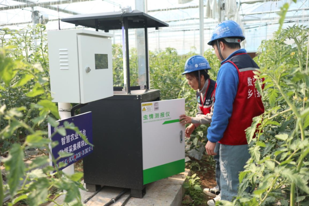 移動技術(shù)人員調(diào)測蔬菜大棚的蟲情傳感設(shè)備。