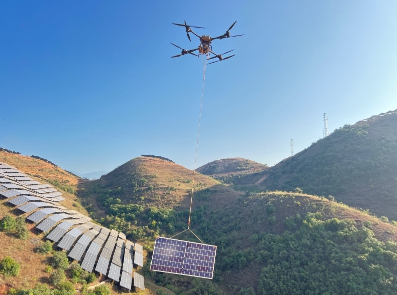 位于河北井陘、云南伍寨等大型山地的光伏項(xiàng)目,無(wú)人機(jī)化身“空中運(yùn)輸奇兵”。它們緊貼近乎垂直的巖壁,將重達(dá)20公斤的光伏支架配件精準(zhǔn)投送至半山腰作業(yè)點(diǎn),以“穿針引線”般的靈巧,徹底破解了山地物流困局。