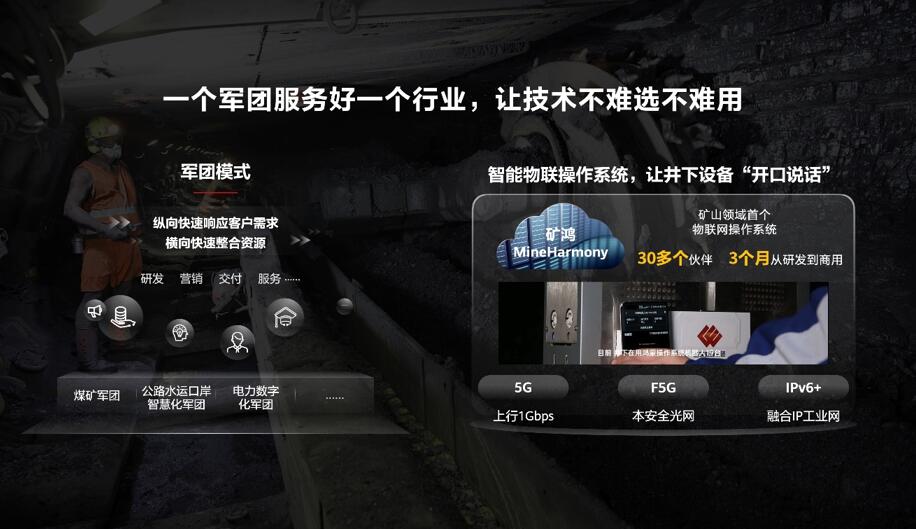 為了幫助企業(yè)選好技術(shù)、用好技術(shù),另一個(gè)關(guān)鍵措施就是成立軍團(tuán)。自去年底,我們已面向煤礦、港口、電力等多個(gè)行業(yè)成立了多個(gè)軍團(tuán)組織。軍團(tuán)是專業(yè)化隊(duì)伍,一方面,對(duì)內(nèi)拉通端到端的資源,包括研發(fā)、銷(xiāo)售、交付、服務(wù)等,以便深入理解行業(yè)的生產(chǎn)實(shí)踐和行業(yè)知識(shí),打造適配場(chǎng)景的產(chǎn)品和解決方案;另一方面,對(duì)外聯(lián)合更多的解決方案伙伴,把華為和伙伴的能力整合在一起,形成針對(duì)性的解決方案。