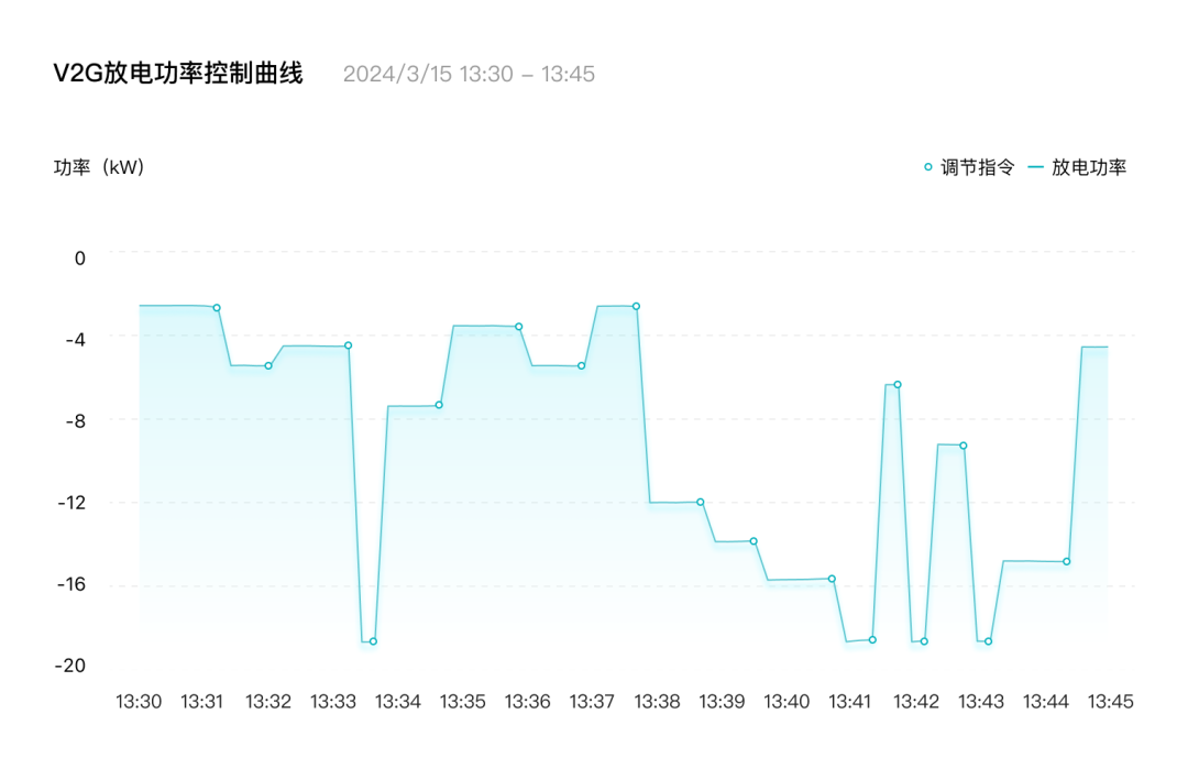 本次試驗(yàn)設(shè)備采用廣汽能源20kW一體式V2G充電樁及昊鉑HT車型,試驗(yàn)中,廣汽能源智慧管理云平臺(tái)模擬接收電網(wǎng)調(diào)控中心(虛擬電廠)的調(diào)頻指令,然后通過ADR技術(shù)連續(xù)15分鐘自動(dòng)控制V2G充電及放電功率,秒級(jí)響應(yīng)虛擬電廠的調(diào)頻需求。