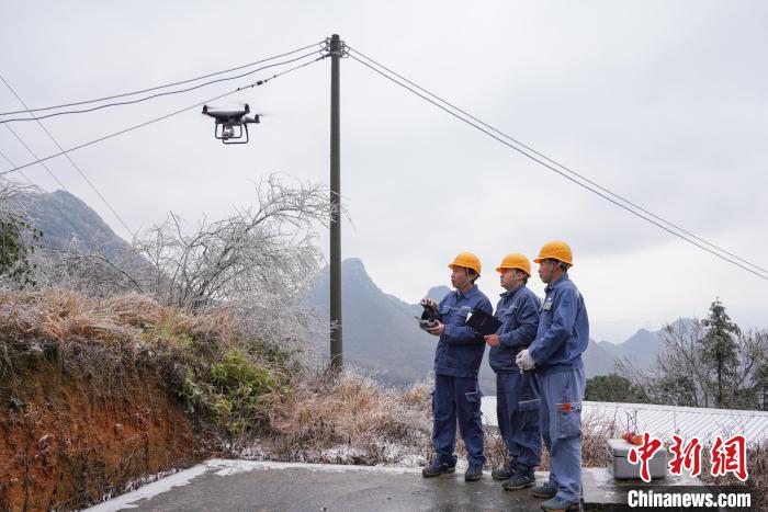 1月23日,南方電網(wǎng)廣東清遠(yuǎn)陽山供電局陽城供電所工作人員采取“人巡+機(jī)巡”模式,觀察、記錄供電線路和配電設(shè)備的覆冰情況。(廣東電網(wǎng)公司供圖)