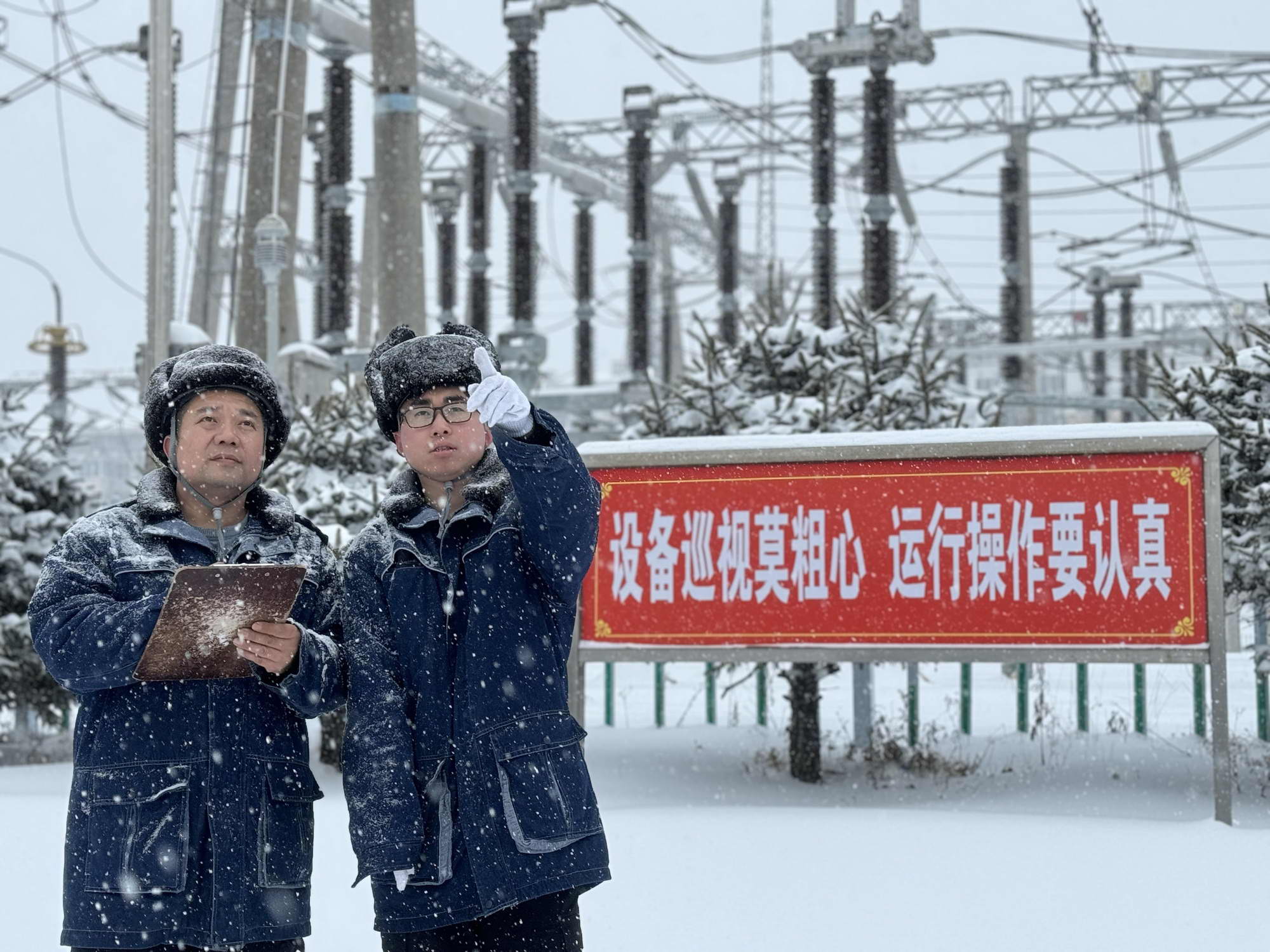 11月26日,降雪期間,黑龍江鶴崗供電公司運(yùn)維人員巡視檢查220千伏鹿金山變電站,護(hù)航電網(wǎng)安全穩(wěn)定運(yùn)行(封沂池 攝)