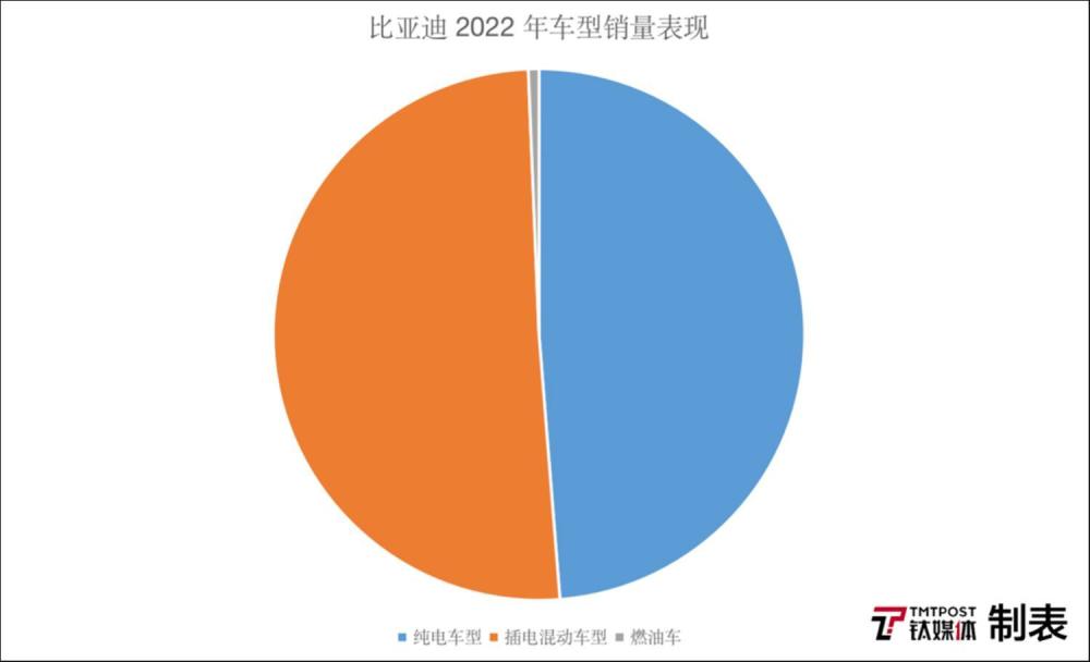數據顯示,比亞迪 2022 年全年累計銷量達到了 186.9 萬輛,其中來自純電車型和插電混動車型銷量分別為 91.1 萬輛、94.6 萬輛,燃油車銷量僅有 1.2 萬輛。