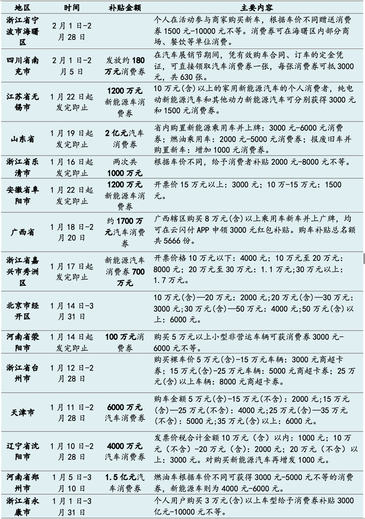 1月16日,浙江省樂清市發(fā)布迎春促消費(fèi)活動,發(fā)放300萬元汽車消費(fèi)券,2月1日,樂清市再度延續(xù)該活動,增加發(fā)放700萬元汽車消費(fèi)券,根據(jù)車價不同,給予消費(fèi)者補(bǔ)貼2000元-8000元不等。