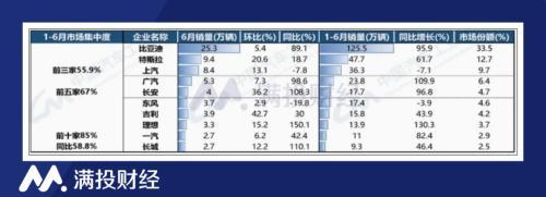 根據(jù)汽車協(xié)會數(shù)據(jù),二季度前十名車企銷量總計318.3萬輛,同比增長58.8%,占新能源汽車總銷量的85%。其中自主品牌的表現(xiàn)亮眼,份額不斷提高,比亞迪以125.5萬的銷量斷層領(lǐng)先,相當(dāng)于第二名特斯拉銷量的2.6倍,比亞迪的市場份額提升至33.5%。上汽以36.3萬的銷量僅次于特斯拉,市場份額9.7%。