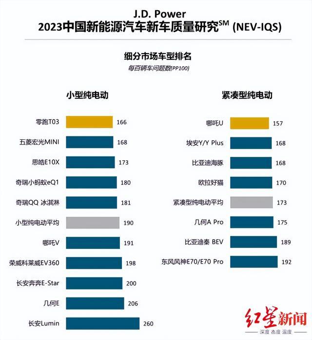 在小型純電動細(xì)分市場,零跑T03以166個PP100排名第一,長安玉米(Lumin)以260個PP100排名倒數(shù)第一,細(xì)分市場平均數(shù)為190個PP100。