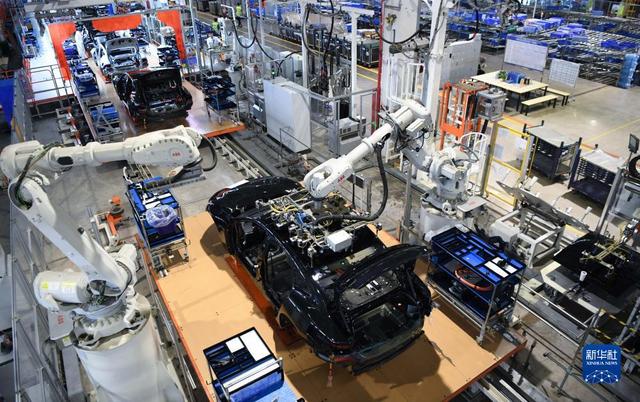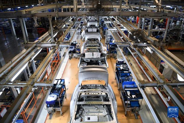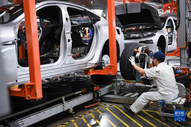 10月9日,工作人員在廣東肇慶小鵬汽車智能網聯科技產業(yè)園內的總裝生產線上工作。