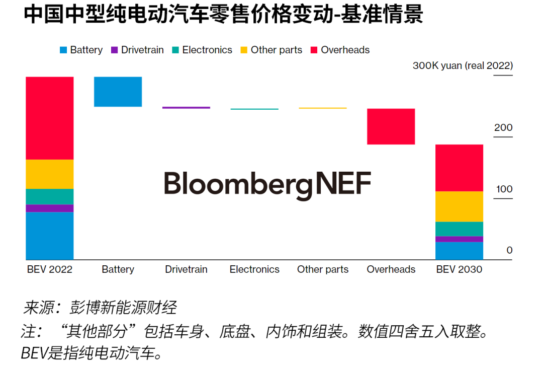 降低成本對新能源車企至關(guān)重要,因為大多數(shù)車企尚未從新能源汽車的銷售中獲利。彭博新能源財經(jīng)估計,從2022年到2030年底,電池價格下跌以及轉(zhuǎn)用專用平臺可能會使中國純電動汽車價格下降40%。結(jié)合其他零部件和系統(tǒng)的改進,這可能會推動純電動汽車在2027年至2029年間實現(xiàn)燃油車平價。更廉價的電池、平臺協(xié)同效應(yīng)和產(chǎn)業(yè)價值鏈整合也是大眾汽車和比亞迪等公司成本降低路線圖的核心。