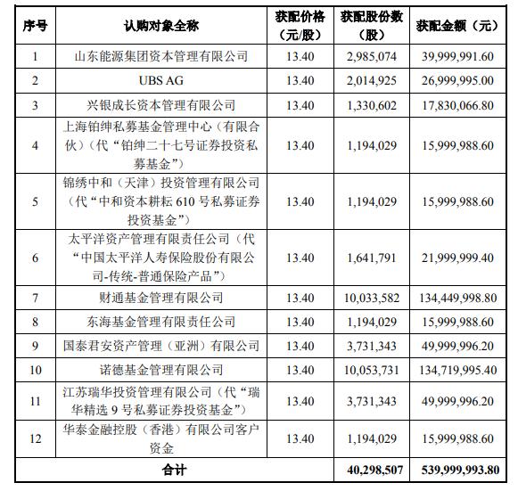 此外,財(cái)通基金管理有限公司、諾德基金管理有限公司、東?;鸸芾碛邢挢?zé)任公司為證券投資基金管理公司,以其管理的資產(chǎn)管理計(jì)劃、公募基金產(chǎn)品或養(yǎng)老金產(chǎn)品參與認(rèn)購(gòu);太平洋(601099)資產(chǎn)管理有限責(zé)任公司為保險(xiǎn)機(jī)構(gòu)投資者;國(guó)泰君安(601211)資產(chǎn)管理(亞洲)有限公司、華泰金融控股(香港)有限公司、UBS AG屬于人民幣合格境外機(jī)構(gòu)投資者(QFII);山東能源集團(tuán)資本管理有限公司以自有資金或自籌資金參與本次發(fā)行認(rèn)購(gòu)。