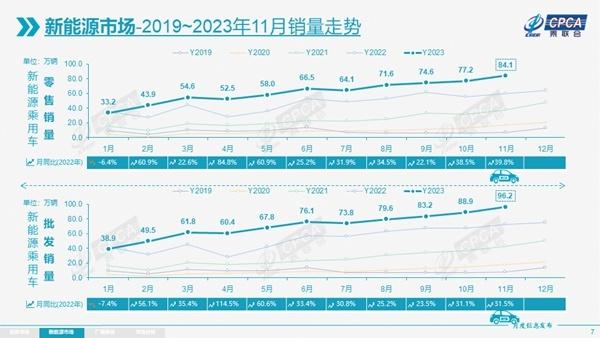 聚焦新能源市場,11月,新能源乘用車生產(chǎn)、批發(fā)、零售同比增速繼續(xù)維持在30%以上。其中,生產(chǎn)98.9萬輛,同比增長37.3%,環(huán)比增長7.2%;批發(fā)96.2萬輛,同比增長31.5%,環(huán)比增長8.2%;零售84.1萬輛,同比增長39.8%,環(huán)比增長8.9%,1-11月累計零售680.9萬輛,同比增長35.2%。