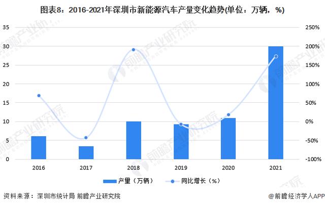 近年來,深圳市新能源汽車產(chǎn)業(yè)發(fā)展迅猛。2018-2020年,深圳市新能源汽車產(chǎn)量維持在9萬輛/年以上,2020年突破了10萬輛;2021年,深圳市新能源汽車產(chǎn)量逼近30萬輛,同比增長174%;同時(shí),在新能源汽車的有效推廣下,全市公交出租均已實(shí)現(xiàn)電動化,2021年全市新能源汽車銷量14.48萬輛,占當(dāng)年汽車銷量比重超40%。