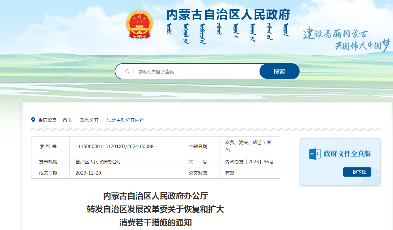 1月5日,內(nèi)蒙古自治區(qū)人民政府辦公廳轉(zhuǎn)發(fā)自治區(qū)發(fā)展改革委關(guān)于《恢復和擴大消費若干措施》的通知。其中提到: