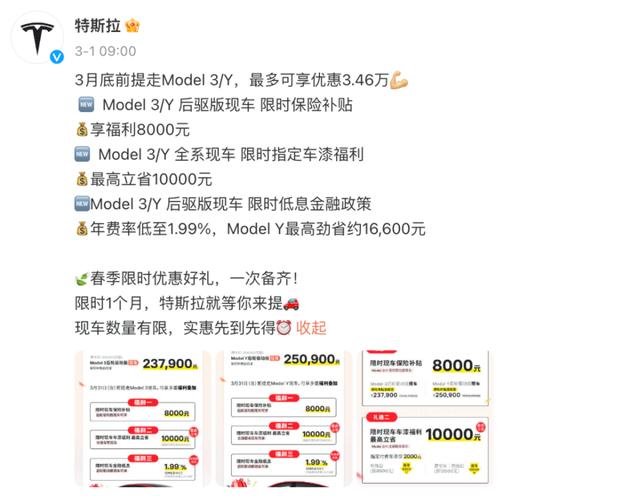 3月1日,特斯拉宣布Model 3、Model Y限時特惠,3月底前提走Model 3/Y,最多可享優(yōu)惠3.46萬。本次特斯拉降價頗為低調(diào),沒有直接調(diào)降車價,而是以保險補貼、車漆福利等名目促銷。Model 3后驅(qū)版新車價245900元,保險補貼后低至237900元。Model Y后驅(qū)版新車價258900元,保險補貼后低至250900元。