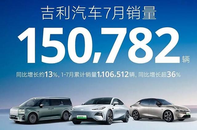 7月,吉利汽車(chē)銷(xiāo)量為150782輛,同比增長(zhǎng)13%;1-7月累計(jì)銷(xiāo)量1106512輛,同比增長(zhǎng)超36%。其中,新能源銷(xiāo)量59051輛,同比增長(zhǎng)58%;1-7月新能源累計(jì)銷(xiāo)量379236輛,同比增長(zhǎng)105%。