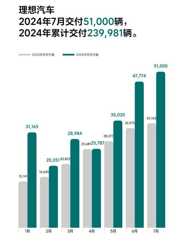 理想汽車(chē)在7月交付新車(chē)51000輛,創(chuàng)月交付量的歷史新高,同比增長(zhǎng)49.4%。今年1-7月,理想共計(jì)交付239981輛。截至2024年7月31日,理想汽車(chē)?yán)塾?jì)交付873345輛。