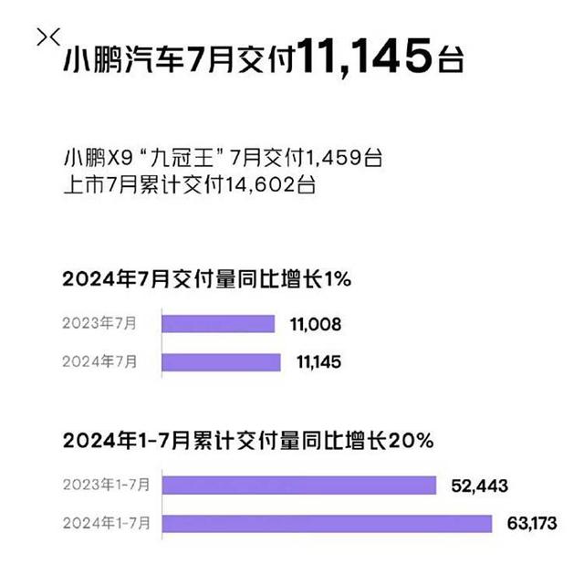 7月小鵬汽車(chē)共交付新車(chē)11,145臺(tái),同比增長(zhǎng)1%,環(huán)比增長(zhǎng)4%。1月-7月,小鵬汽車(chē)?yán)塾?jì)交付新車(chē)共63,173臺(tái),同比增長(zhǎng)20%。