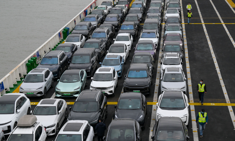 在秀英港,代泊司機(jī)在新能源車專用運(yùn)輸船上停放車輛后下船。 新華社記者 楊冠宇 攝