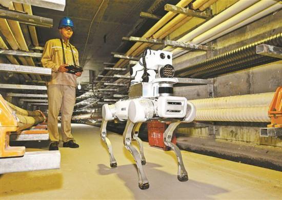 在廈門翔安海底電纜隧道內(nèi),搭載高清攝像頭、紅外熱像儀等智能傳感器的機(jī)器狗開展電纜巡檢。