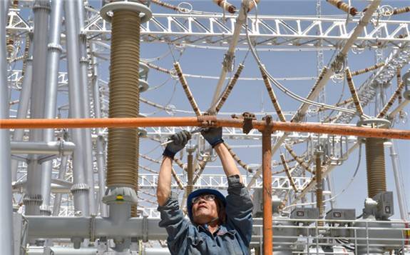 5月27日,工作人員在位于寧夏吳忠市同心縣的妙嶺750千伏變電站施工現(xiàn)場(chǎng)施工。