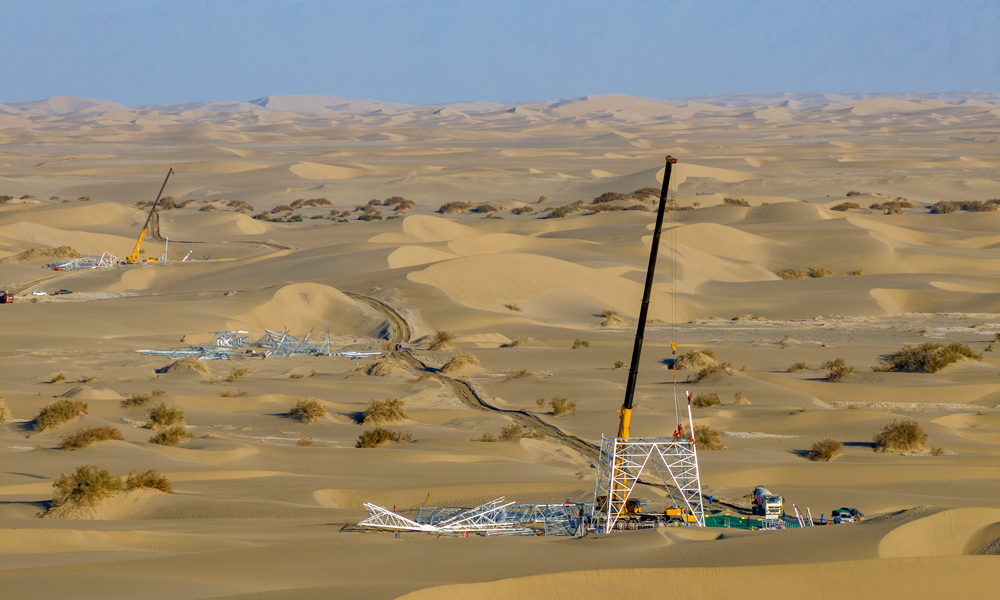 近日,山東送變電工程有限公司施工人員開展新疆750千伏且末—若羌輸電線路工程Ⅱ標(biāo)段鐵塔組立作業(yè)。該標(biāo)段線路長110.85千米,全線位于塔克拉瑪干沙漠,共計新建鐵塔225基。