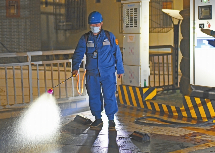 從2月2日晚上開(kāi)始,廣西電網(wǎng)公司南寧邕寧供電局黨員服務(wù)隊(duì)每天組織3名黨員,在23時(shí)后對(duì)供電區(qū)域內(nèi)的電動(dòng)汽車充電站進(jìn)行全面消毒,減少對(duì)用戶的影響,確保充電環(huán)境安全。馬華斌 攝