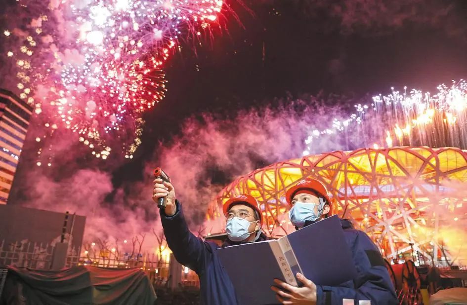 北京冬奧會(huì)閉幕式期間,國網(wǎng)北京電力冬奧保障人員在國家體育場附近巡檢供電設(shè)備。翟磊 攝