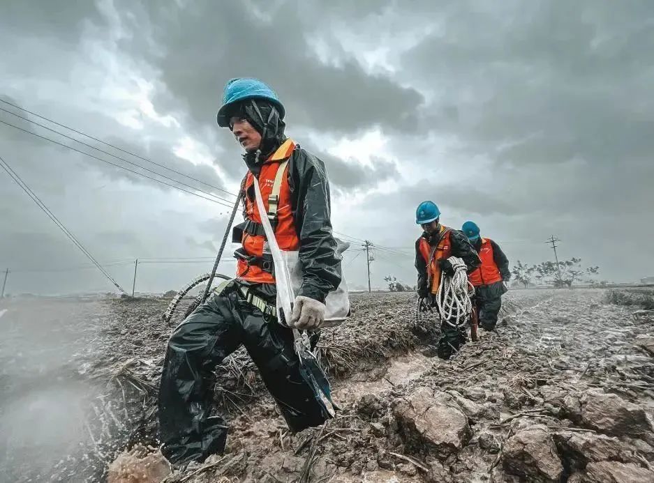 臺(tái)風(fēng)“梅花”在浙江舟山普陀沿海登陸后,國網(wǎng)浙江電力員工穿過泥濘的田地前往故障點(diǎn)開展搶修。程夢玨 攝