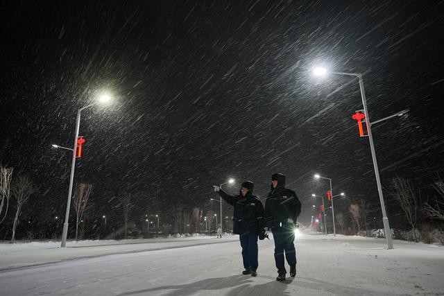 國網(wǎng)蒙東電力員工對(duì)保暖涉及配電線路進(jìn)行夜巡。