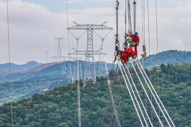 國(guó)網(wǎng)寧夏送變電公司施工人員在寧夏—湖南±800千伏特高壓直流輸電工程進(jìn)行平衡掛線作業(yè)。